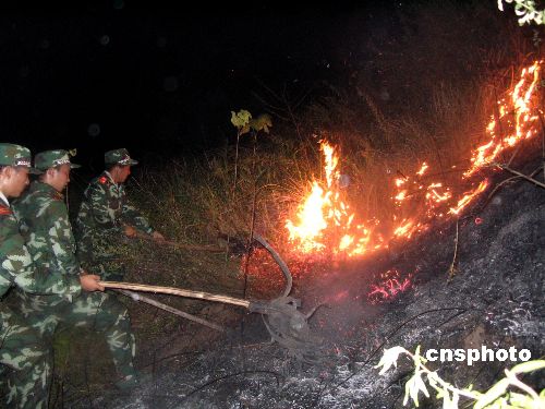 2006年8月22日晚,消防战士正在奋力扑救山火。当日,贵州省桐梓县柏果树发生一起森林火灾,造成60余亩树木瞬间毁于旦夕,消防战士经过3个多小时的奋力扑救,才将大火扑灭。中新社发 张绍明 摄