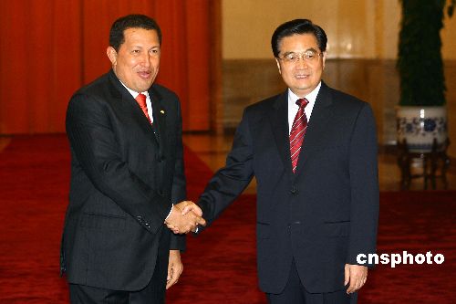 八月二十四日,中国国家主席胡锦涛在北京人民大会堂与来华进行国事访问的委内瑞拉总统查韦斯举行会谈。双方一致同意,进一步深化两国各领域互利合作,推动中委共同发展的战略伙伴关系再上新台阶。中新社发 盛佳鹏 摄