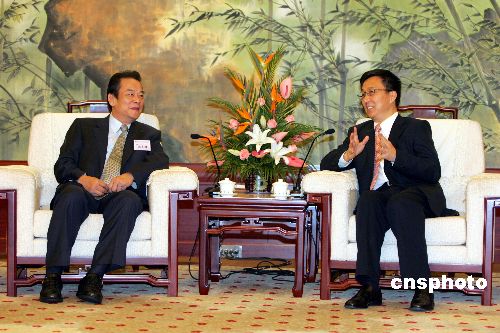 八月二十五日,上海市市长韩正(图右)在沪会见了由台湾工业总会理事长陈武雄(图左)率领的“台湾工业总会大陆经贸考察团”一行。中新社发 汤彦俊 摄