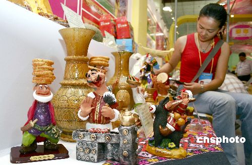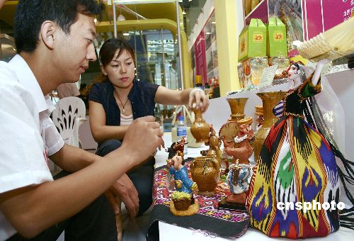 八月三十日,参加第十五届乌鲁木齐经济贸易洽谈会的新疆喀什代表团工作人员正在将具有喀什地方特色的饰品摆放在展台上。新疆最大的经贸盛会“第十五届乌洽会”开幕在即,新疆国际博览中心内的布展工作正紧张有序的进行当中。据悉,本届乌洽会已确认到会的中外客商达千余人,国内代表团已达十个,同时哈萨克斯坦、吉尔吉斯斯坦、俄罗斯西伯利亚地区、巴基斯坦、香港、韩国、日本等国家和地区也均有客商参展。中新社发 刘新 摄