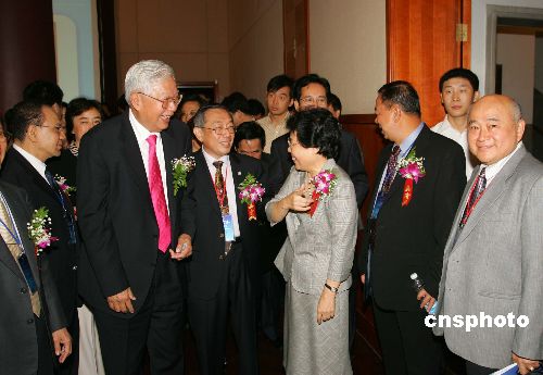 九月五日,“第三届华商企业科技创新合作交流会”在上海开幕,全国政协副主席罗豪才(左二)、国务院侨办主任陈玉杰(女)与海内外华商叙友情、话商机。本届“华交会”以“2010年上海世博会”为机遇,促进华商企业创新共赢,吸引了海内外四百多华商领袖和代表与会。中新社发 潘索菲 摄