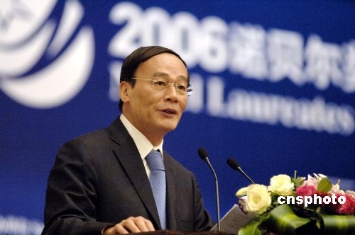 “二零零六年诺贝尔奖获得者北京论坛”九月五日上午在北京人民大会堂开幕,北京市市长王岐山致欢迎辞。本次论坛的主题为“生命科学与人类健康”,包括李政道、罗伯特·胡伯尔等七位诺奖得主以及其他世界知名生命科学家和国内生物医学领域科学家将开始“颠峰对话”。中新社发 徐曦弋 摄