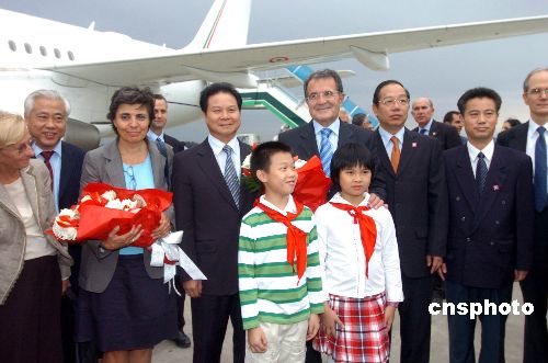 意大利总理普罗迪夫妇一行,十四日乘专机下午抵达广州进行访问。普罗迪总理还将率团参加十五日上午开幕,由中国同意大利共同举办的第三届中国国际中小企业博览会。中新社发 柯小军 摄