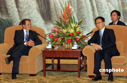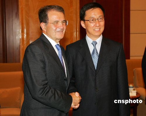 九月十六日,上海市市长韩正在此间会见并宴请了意大利共和国总理罗马诺·普罗迪一行。两位老友相见,非常高兴。普罗迪说,意大利已正式确认参展二零一零年上海世博会,意大利将尽快完成“意大利国家馆”的设计方案招标。中新社发 潘索菲 摄