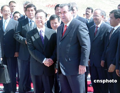 中国国务院总理温家宝九月十六日同塔吉克斯坦总统拉赫莫诺夫一道出席了塔吉克斯坦五百千伏南北高压输变电线项目开工典礼。中新社发 孙宇挺 摄