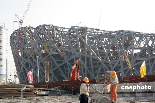 9月17日,举世瞩目的第29届奥运会主会场——国家体育场“鸟巢”完成了它工程建设中最富有悬念的一道程序——钢结构卸载。这就意味着,这个世界上最大跨度的钢结构建筑依靠自身,而不是外力,支撑起了全部重量。许多中外人士纷纷到“鸟巢”周围,一睹它的风采。中新社发 陈晓根 摄