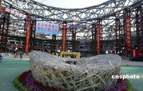 九月十七日,倍受世人关注的北京2008年奥运会主会场—国家体育场钢结构主桁架成功卸载。这次卸载的钢结构总重量达到一万四千吨,卸载共设七十八个点,安装了一百五十六个千斤顶,采取分级同步卸载,分外圈、中圈、内圈三级统一布控,采用中央处理器,实施自动同步卸载的方法进行。中新社发 任海霞 摄