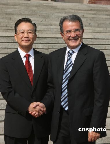 九月十八日,中国国务院总理温家宝在北京人民大会堂欢迎来访的意大利总理普罗迪。中新社发 廖文静 摄