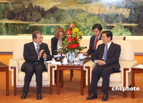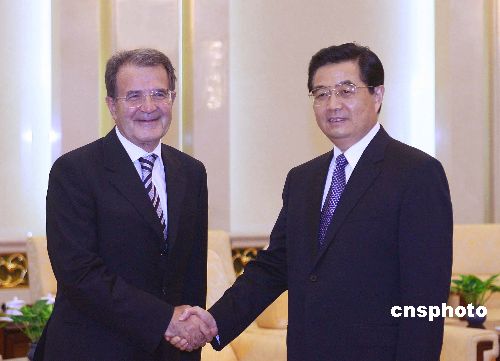 九月十八日,中国国家主席胡锦涛在北京人民大会堂会见了意大利总理普罗迪。中新社发 廖文静 摄