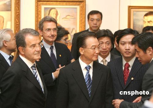 九月十八日,中国总理温家宝与意大利总理普罗迪在中国美术馆共同参观了意大利综合艺术展。 中新社发 廖文静 摄