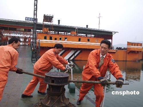 | 9月21日,长江三峡大坝下游宜昌港客运公司的水手们推动绞锚机,将趸跳船往江心移动,以防江水退落趸船搁浅。当天是三峡大坝蓄水第二天,9时水位已长到136米高程,预计10月中旬蓄水到156米高程,三峡水库库容从140亿立方米达到250亿立方米。葛洲坝坝下的宜昌港客运公司,为防止水位下落船舶搁浅而不断地将趸跳船往江心移动;三峡库区近坝的宜昌港归州站、秭归港、太平溪港等航运设施,将随着水位的上升逐渐上移。中新社发 韩玉洪 摄