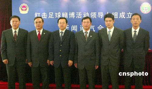 九月三十日,公安部治安管理局、公共信息网络安全监察局和中国足球协会联合组建“打击足球赌博活动领导小组”,公安部治安管理局副局长吴明山任组长,中国足协副主席南勇任副组长,工作人员分别由公安部、中国足协的相关人员组成。吴明山(左三)表示,希望足球界业内人员和足球界之外的相关人员,都能够清醒地认识到参加足球赌博活动的严重性质,自觉远离这种违法活动。中新社发 杜洋 摄