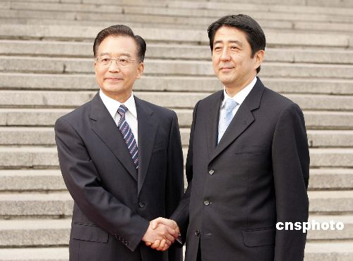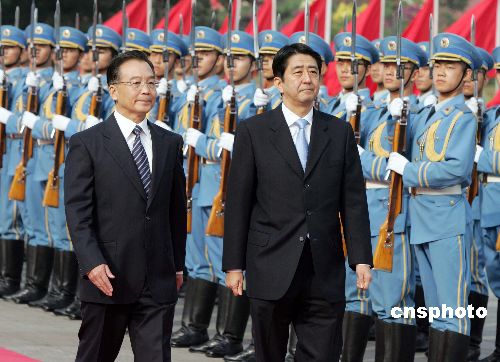 中国国务院总理温家宝十月八日在北京人民大会堂东门外广场主持仪式,欢迎来访的日本首相安倍晋三。这是安倍晋三出任日本首相后首次出访。中新社发 毛建军 摄