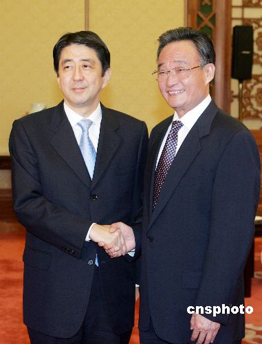 中国全国人大常委会委员长吴邦国十月八日在北京人民大会堂会见来访的日本首相安倍晋三。中新社发 毛建军 摄