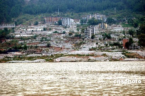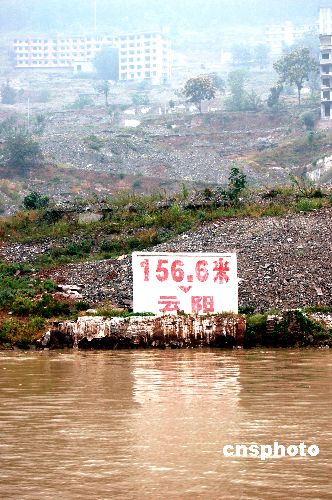 10月18日18时,三峡工程三期蓄水水位已达153.77米,海拔在156米上下的原重庆云阳县城,已有一半没入水中,废墟上残存的是四期水位尚未清库的空楼断垣。据悉,云阳县城落户云阳镇1400余年,三峡工程蓄水前,该镇辖有11个居委会,4.8万余人,幅员面积2.672平方公里。自1992年10月正式启动搬迁工程以来,移民全部迁至双江镇。中新社发 周斌 摄