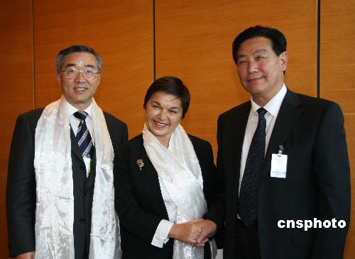 10月20日,中国西藏周代表团在维也纳联合国办事处同一些国家的常驻大使以及联合国高级官员十多人举行午餐会,代表团成员一一回答了各界对西藏感兴趣的各种问题。图为团长李文光(右)给维也纳联合国办事处副总干事诺颜女士和中国常驻维也纳代表团大使唐国强(左)献上了祝福的哈达。中新社发 钟诚 摄