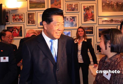 当地时间二十三日晚,中国全国政协主席贾庆林在伦敦出席“镜头中的西藏”摄影展开幕式。中新社发 李鹏 摄