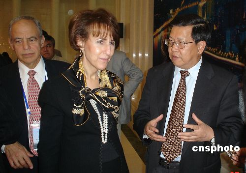 十月二十七日下午,博鳌亚洲论坛秘书长龙永图与美国前贸易代表巴尔舍夫斯基在“第三届北京论坛”上会面,他们两人曾代表中美两国,就中国加入世贸组织进行了为期数年的艰难谈判。今年恰逢中国加入世贸组织五周年,两人的会面颇具象征性意味。中新社发 周兆军 摄