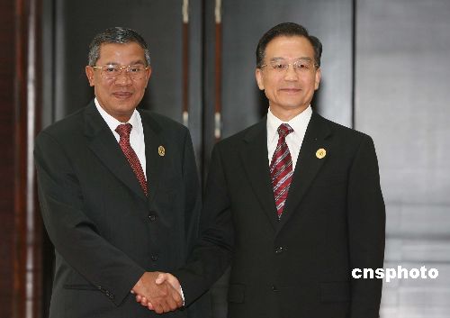 十月三十日,中国—东盟建立对话关系十五周年纪念峰会在广西南宁荔园山庄国际会议中心开幕。图为中国国务院总理温家宝欢迎柬埔寨首相洪森。中新社发 廖文静 摄