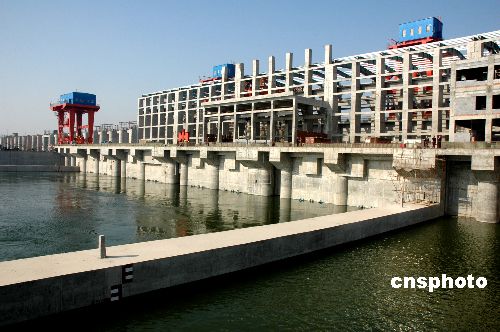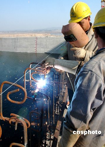 在工程技术人员的精心施工下,黄河小浪底水利枢纽配套工程——西霞院反调节水库工程大坝已达到截流高程,地下导流、电站厂房等重点部位建设也符合截流条件,将于11月6日合龙截流。黄河西霞院水库位于小浪底下游16公里处,水库设计库容为1.62亿立方米,计划于2008年建成。中新社发 田草 摄