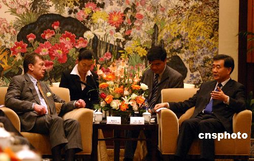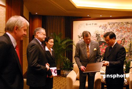 十一月三日,中共重庆市委书记汪洋会见美国博富文柑橘有限公司主席Edgar M·Bronfman一行五人。据介绍,由全国政协副主席、香港特区首任行政长官董建华牵线“作媒”,美国博富文柑橘有限公司将在重庆三峡库区投资建设柑橘基地和果汁加工厂。中新社发 郭晋嘉 摄