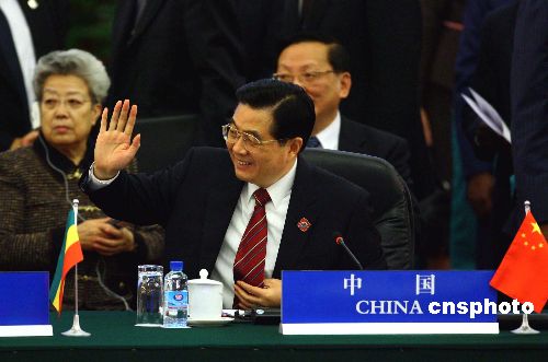 十一月五日,中非合作论坛北京峰会圆桌会议在北京人民大会堂举行。会议将就非洲发展、中非合作等问题展开深入讨论,并将审议通过《中非合作论坛北京峰会宣言》、《中非合作论坛——北京行动计划二零零七年至二零零九年》。中国国家主席胡锦涛和四十八个非洲与会代表团团长和非盟委员会主席出席。会议分上午、下午两个阶段进行,胡锦涛主持第一阶段会议。中新社发 盛佳鹏 摄