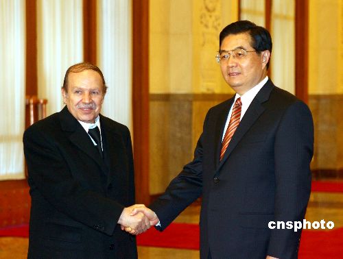 十一月六日,中国国家主席胡锦涛在北京人民大会堂主持仪式欢迎阿尔及利亚总统布特弗利卡。中新社发 廖文静 摄