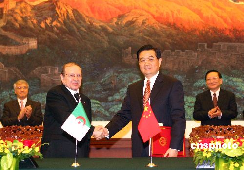 十一月六日,中国国家主席胡锦涛在北京人民大会堂与阿尔及利亚总统布特弗利卡举行会谈。会后中国与阿尔及利亚签署八项合作文本。中新社发 廖文静 摄