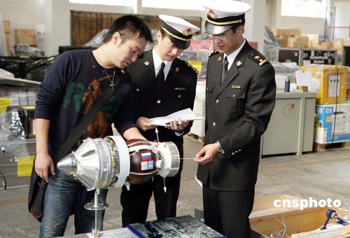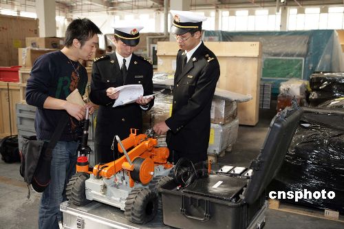 11月7日,俄罗斯国家展的最后一批参展物资在北京海关完成通关手续,至此,俄罗斯国家展的全部物资都已经完成了通关手续。这次俄罗斯国家展的展品主要有汽车、食品、轻工产品、艺术品、航天模型等,展品于2006年10月24日开始申请报关进口。共申报进口参展货物19票,总量约20吨,进口货物总值约24万美元。据介绍,即将开幕的“俄罗斯国家展”是“俄罗斯年”经贸领域的国家级大型活动,是近年来俄在华举办的规模最大的展会,此次展览将于2006年11月8日—13日在中国国际贸易中心举行。中新社发 雷虹 摄