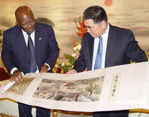 十一月七日晚,河南省省长李成玉向到访的塞拉利昂共和国总统艾哈迈德.泰詹.卡巴赠送书画作品。塞拉利昂共和国总统艾哈迈德.泰詹.卡巴一行于当日下午两点三十分抵达河南,进行为期两天的访问。中新社发 史宝银 摄