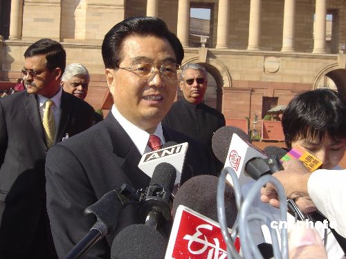 正在印度新德里访问的中国国家主席胡锦涛接受中印两国记者的采访。二十一日,中印两国发表联合声明,进一步充实和加强两国战略合作伙伴关系。中新社发 于晶波 摄