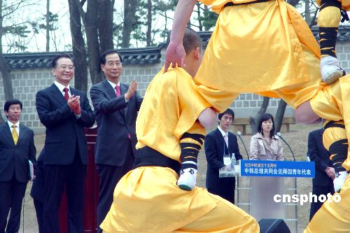 中国总理温家宝和韩国总理韩德洙10日在首尔景福宫集玉斋共同会见了中韩两国青年代表团一行约三百人。会见以后,两国总理共同观赏了中国青年表演的少林功夫和韩国青年的街舞。图为中韩两国总理观赏中国少林功夫中的罗汉塔。中新社发 孙宇挺 摄