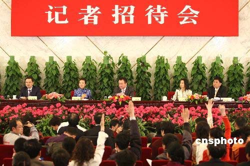 3月8日,全国政协十一届一次会议举行记者招待会,主题是“新阶层人士谈社会责任”,邀请王健林(左三)、刘红宇(左二)、刘迎霞(右二)、徐冠巨(左一)、韩方明(右一)五位新阶层委员出席,引来众多媒体的关注。王健林是大连万达集团股份有限公司董事长、总裁。刘红宇为北京市金诚同达律师事务所创始合伙人律师。刘迎霞为哈尔滨翔鹰集团股份有限公司董事长。徐冠巨任浙江省工商业联合会主席、浙江省商会会长、传化集团有限公司董事长。韩方明为职业投资银行家,现任TCL集团股份有限公司执行董事。中新社发 盛佳鹏 摄