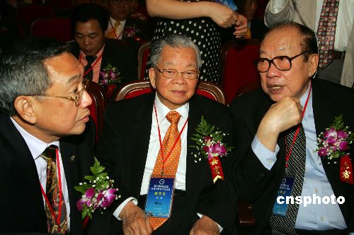 九月五日,“第三届华商企业科技创新合作交流会”在上海开幕,图为印尼融侨集团董事长林文镜(右)、印尼华商陈大江(中)、林文光出席会议。中新社发 潘索菲 摄