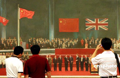 六月二十九日,由全国政协书画室和香港中华文化总会主办的庆祝香港回归十周年中国著名画家作品展在北京开幕。图为大型油画《回归》引人关注。中新社发 廖文静 摄