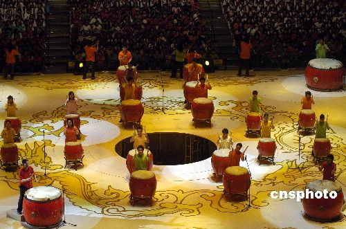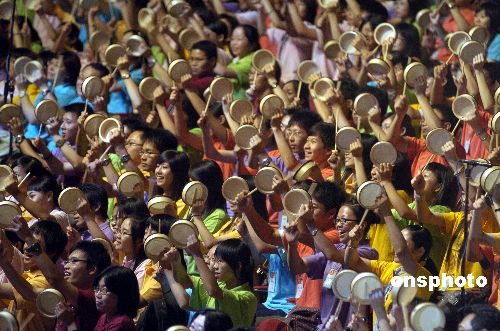 | 2007年6月29日,为庆祝香港回归祖国10周年,万名来自内地、香港、澳门、台湾的青年齐集香港体育馆,以“鼓乐飞扬”的创意、励志激昂的乐曲为蓝本、击打万面鼓的形式,创出新的吉尼斯世界纪录。本次活动主题为《龙声鼓舞--万人青年音乐会》,由香港民政事务局、中华全国青年联合会、香港青年协会及中央电视台等有关机构联合举办。万人鼓乐《龙的传人》和《红日》曲目由著名打击乐家龙向荣博士编曲及领奏,以五种鼓乐合奏,包括铃鼓、布郎鼓、双棍单皮鼓、沙槌鼓和皮手鼓,在超过一万名青年齐心合奏下完成。中新社发 吴峻 摄