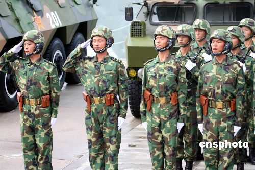 六月三十日上午,英姿勃发的驻港部队官兵在香港昂船洲海军基地列队,准备接受胡锦涛主席检阅。中新社发 王丽南 摄