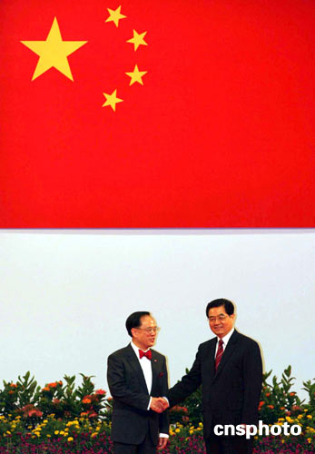 七月一日上午,香港特别行政区第三届政府就职典礼在香港会展中心举行。香港特区行政长官曾荫权宣誓就任后,与监誓人、中国国家主席胡锦涛握手致意。中新社发 武仲林 摄