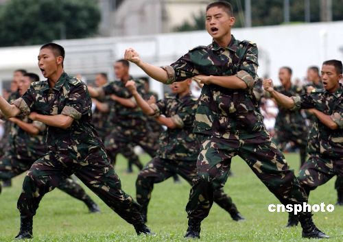 庆祝香港回归十周年的大巡游,7月1日在跑马地马场出发,在巡游开始前,驻港部队表演军操。中新社发 谭达明 摄