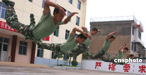 7月21日,武警战士们在烈日下刻苦训练。当天是今夏入伏的第二天,武警陕西省咸阳市支队的武警战士们冒着高温进行体能、擒敌技术、应急防暴等科目训练,加紧苦练精兵。中新社发 何建虎 摄