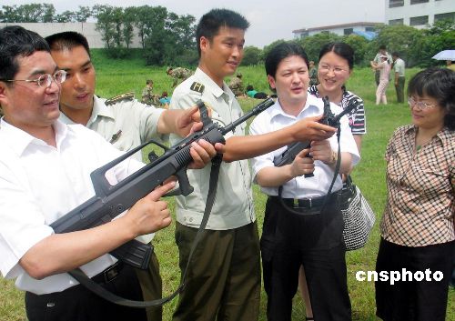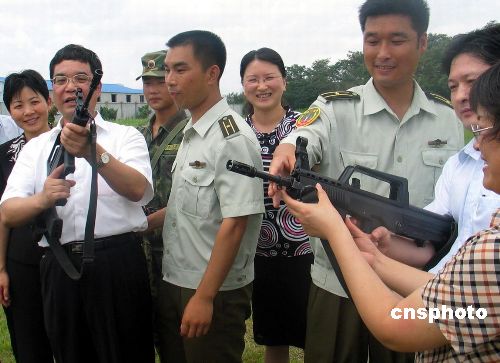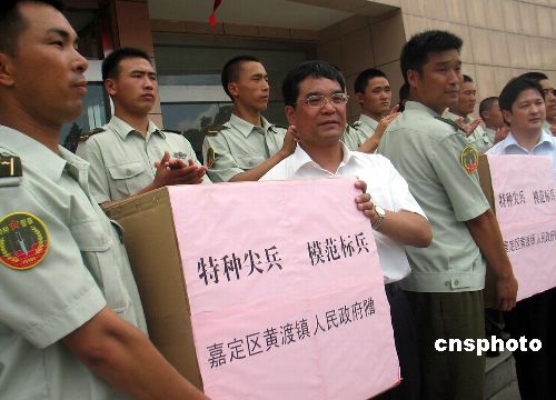 2006年7月27日,上海“双拥模范镇”嘉定区黄渡镇人民武装民兵和部分村民,向上海警备区特种尖兵部队、好八连所属团部赠送300套夏季野训服装以及日常生活用品,慰问海训结束回到驻地的官兵,提前庆祝建军节。中新社发 陈焕联 摄