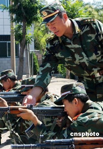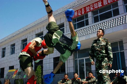 2006年8月3日,宁夏武警某部反恐中队战士冒着35摄氏度的高温酷暑,苦练散打、越障、攀登、一枪毙敌等军事技术,精心磨砺反恐、处突的制胜之剑。该部官兵冬练三九、夏练三伏,多次圆满完成执勤、处突、反恐任务。中新社发 张波wj 摄