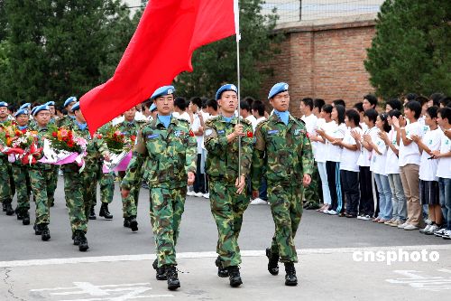 8月29日下午,中国第五批赴刚果(金)执行联合国维和任务的工兵分队80名官兵在圆满完成8个月的工作任务后凯旋而归。中新社发 李堃 摄