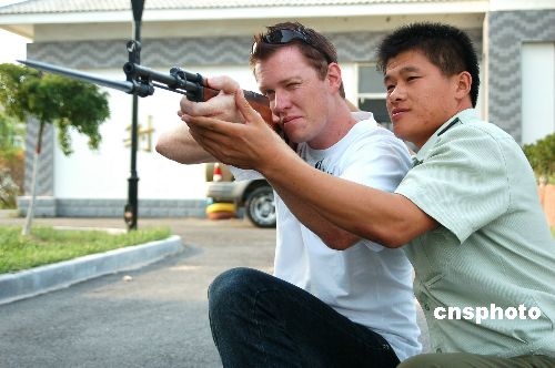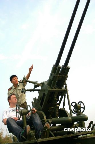 来自澳大利亚昆士兰州的乔纳森(Jonathan)走进山东滨州秦台军事训练基地,当起了“大兵”,体验中国军营生活。乔纳森2006年2月来到滨州,目前在一家外语学校任教,他从小就对中国军营的生活充满了好奇与神秘。8月28日,他利用工作之余专程赶到滨州秦台军事训练基地,详细了解中国的现代化兵器,与武警战士一起学练飞机驾驶、高炮操作、步枪实弹射击。中新社发 梁宝海 摄