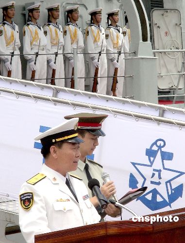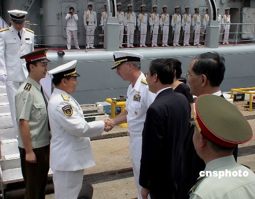 美国当地时间九月六日中午,中国海军舰艇编队驶进美国夏威夷珍珠港访问,美国海军夏威夷军区司令员亚历山大少将欢迎中国海军北海舰队副司令员王福山少将率领将士来访。中新社发 贾国荣 摄