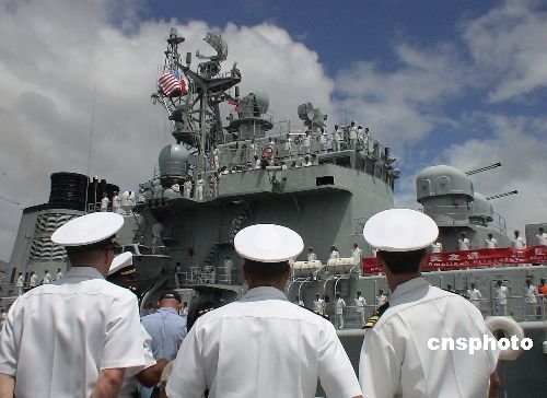 美国夏威夷当地时间九月十日上午,访美中国海军舰艇编队驶离珍珠港,美国海军伊格少将率部为中国海军舰艇编队送行,许多美国海军官兵希望将来能回访中国军港。中新社发 贾国荣 摄