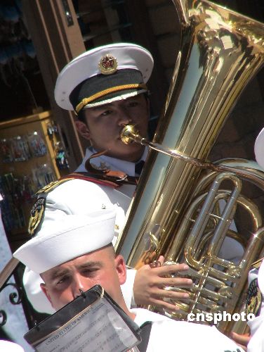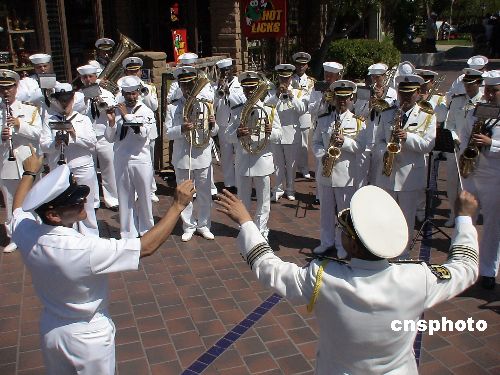 当地时间九月十九日,中国海军舰艇出访编队的军乐队与美国西南地区海军的军乐队联合在圣地亚哥旅游胜地海港村共同演奏中美名曲,受到美国和世界各国游客的热烈欢迎。中新社发 贾国荣 摄