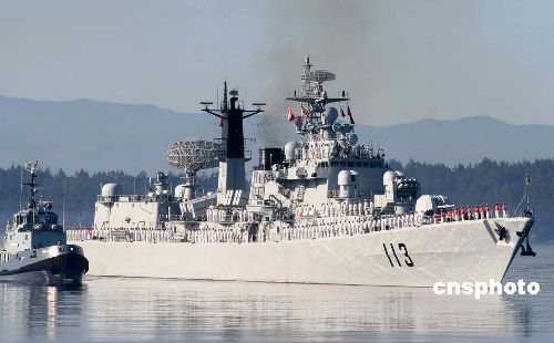 当地时间九月二十五日上午,由“青岛号”导弹驱逐舰和“洪泽湖号”综合补给舰组成的中国海军舰艇编队抵达加拿大西海岸维多利亚,开始对加拿大进行为期五天的友好访问。访问期间,中加海军将联合举行海上编队机动演练,并举行友好足球赛等丰富多采的联谊活动。图为中国军舰驶进大维多利亚地区加拿大海军太平洋舰队司令部所在地埃斯奎莫尔特港。中新社发 吕振亚 摄