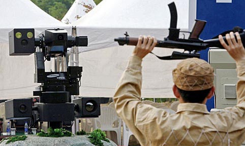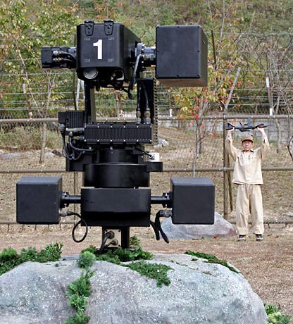 9月28日,在韩国首都首尔以南约90公里处,一款新型的武装机器人哨兵正在接受测试。 这款机器人哨兵能探测入侵者、发出警报并对入侵者进行火力攻击。