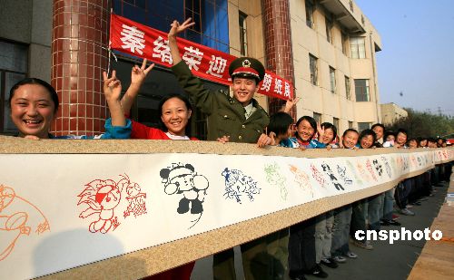 北京某部军人秦绪荣自己耗时四个多月创作出奥运福娃剪纸长卷“军娃献福娃”,10月10日,他将作品带回故土山东济南长清区平安中学,向老师、学生和乡亲们出展。这幅剪纸长卷长29米,宽56厘米,象征第29届北京奥运会和56个民族大团结,画幅上38个福娃是各种运动项目中的形象。中新社发 周青先 摄